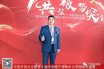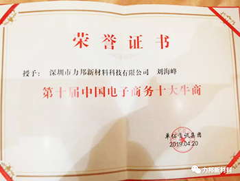 2019.4.20日下午,第十屆中國電子商務全國十大牛商頒獎典禮在深圳廣播電影電視集團演播大廳圓滿結束。其中深圳市力邦新材料科技有限公司董事長劉海峰榮獲“全國十大牛商稱號”!